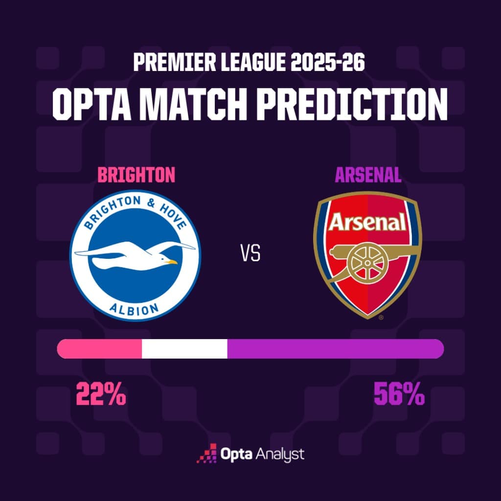 - Opta超级计算机将阿森纳评为本场比赛的热门,胜率为56%,布莱顿为22%。