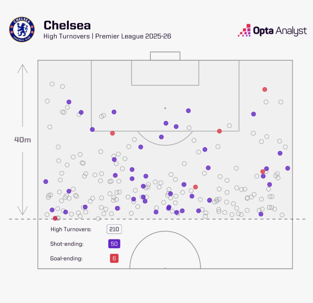 本赛季英超中,曼城(51次)和切尔西(50次)在高失误后射门次数比其他任何球队都多。