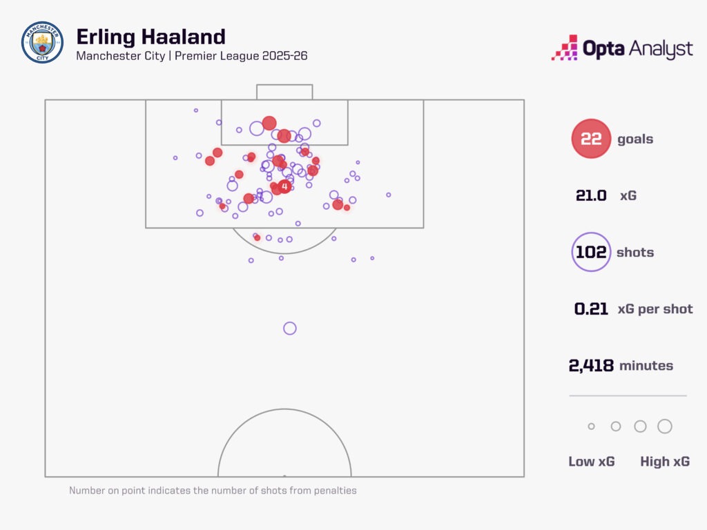 然而,在本赛季圣诞节前,哈兰德在英超17场比赛中打进19球,此后他在曼城的最近12场比赛中仅打进3球,其中两球是点球。